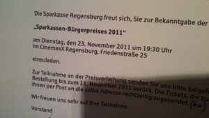 „Die Gewinner des Online-Preises haben es jeweils geschafft, für ihr bewundernswertes ehrenamtliches Engagement zahlreiche Menschen zu begeistern und sie zur Stimmabgabe im Rahmen des Online-Votings zum ‚Sparkassen-Bürgerpreis 2011’ zu bewegen“, gratulierte Franz-Xaver Lindl, Vorstandsvorsitzender der Sparkasse Regensburg, auch im Namen der Medienpartner den vier Glücklichen und deren Mitstreitern. „Jede Stimme zählte“, betonte Lindl die Relevanz der Teilnahme an der Online-Abstimmung. Denn schließlich sei jede abgegebene Stimme auch eine Zustimmung zum Ehrenamt an sich, das unbedingt gefördert werden müsse, „damit unsere Gesellschaft auch in Zukunft funktioniert. Denn wir benötigen sie alle“. Die abgegebenen Stimmen seien daher ein wunderbares Zeichen für Solidarität und Einsatzwillen.