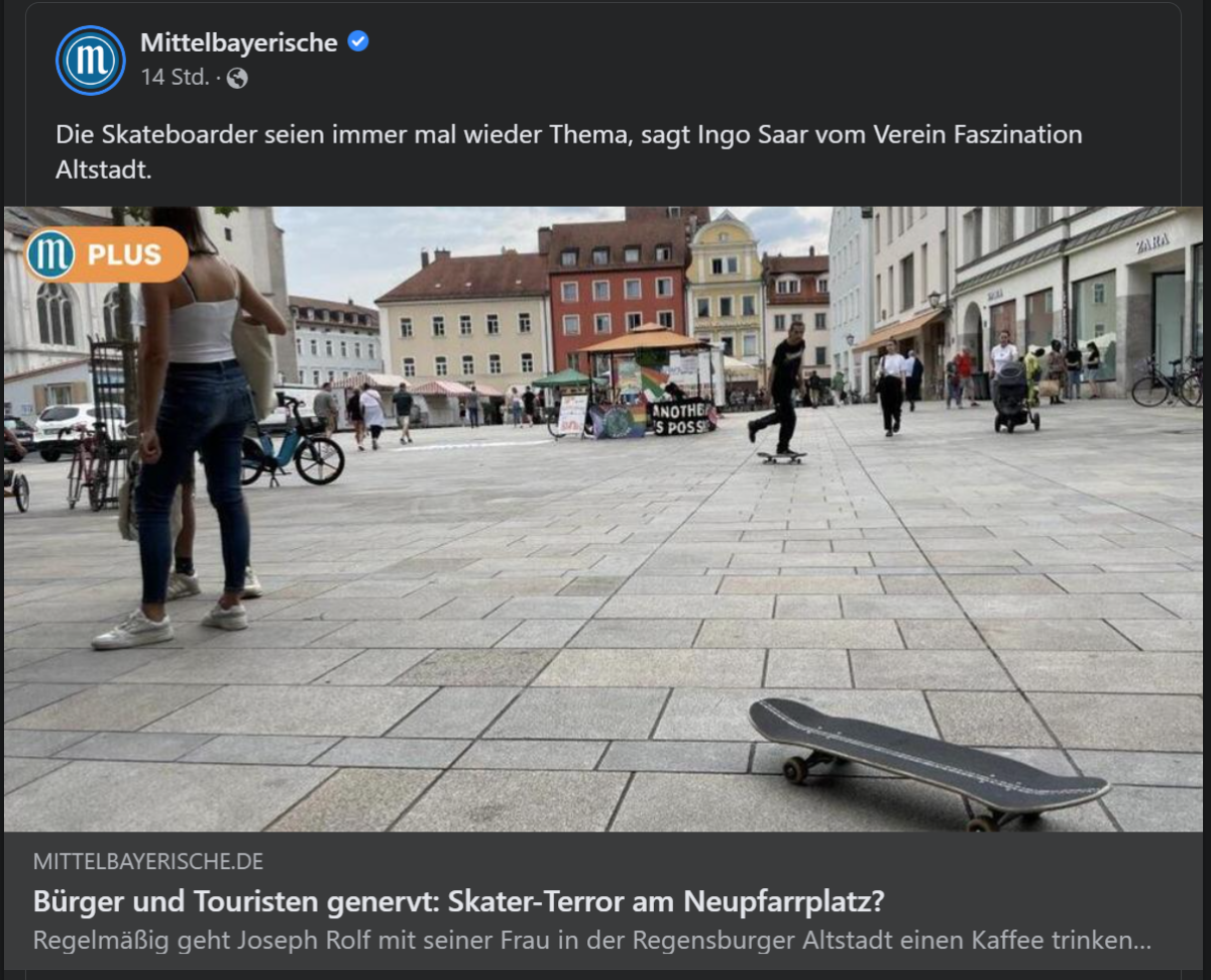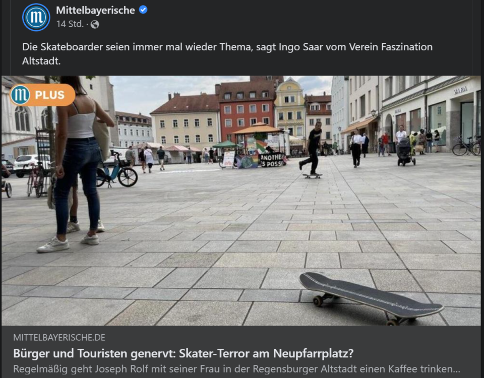 Nach dem Erscheinen des Artikels der MZ ‚Bürger und Touristen genervt: Skater-Terror am Neupfarrplatz?‚ (>>Stellungnahme zum Artikel<<) sind nun alle Beteiligten zusammengekommen und haben sich über […]